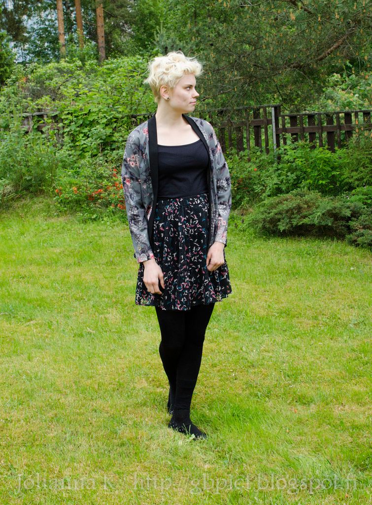 Maanantain asu osottautui hieman liian viileäksi tuohon päivään ja taisin vilustua hieman, kurkku on nyt muutaman päivän kutissut, nenäkin vuotaa. Kuulemma flunssaa on liikkeellä, toivottavasti ei minuun ole itseään tartuttanut. Joka tapauksessa tuo topin päällä oleva tsydeemi on miusta ihan verhon näköinen ja tuntuinen, siitä otsikkokin. Tykkään siitä kuitenkin tosi paljon ja pitipä sitä kokeilla tähän asuyhdistelmään. Omaa silmää miellyttää :)